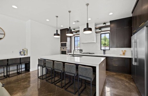 This kitchen is made for large gatherings with seating for 26, and 10 more just on the patio. It has 2 side by side refrigerators with water dispensers, a built in ice maker for all your drinks, 5 burner gas stove, 2 convection ovens, and stocked with all the things you need to prep your meals.