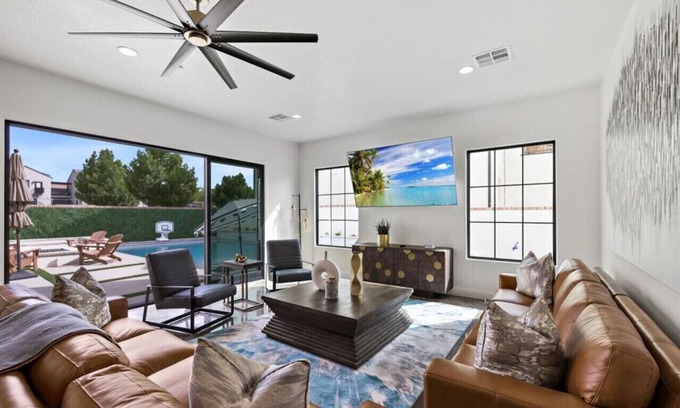 Casablanca is an amazing well planned and meticolously decorated luxury villa at the heart of Sand Hallow. 5 king on-suites with private bathrooms, huge bunk room with two bathrooms. Large private heated pool and 10 person spa. 75" smart TVs in every bedroom and 85" tvs in each of the two spacious family rooms. Getting bored? Never! Putting green, kid friendly axe throwing, 8 arcade machines, Xbox, board games, private pool and hot tub, access to pickle ball courts, gym, and more pools!