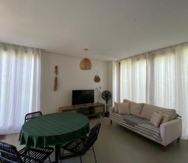 Providing a garden, Casa Brisa - sossego a 50 mts da Praia da Bombaça em Barra Grande features accommodations in Marau. This villa provides air-conditioned accommodations with a terrace and free Wifi. Pool views are a highlight at the villa's rooftop pool. This villa includes 2 bedrooms, a living room and a flat-screen TV, an equipped kitchen with a dining area, and 3 bathrooms with a shower and a washing machine. Towels and bed linen are featured in the villa. The property has an outdoor dining area. Ponta do Muta Beach is a few steps from Casa Brisa - sossego a 50 mts da Praia da Bombaça em Barra Grande. Barra Grande Airport is 2.5 miles away.