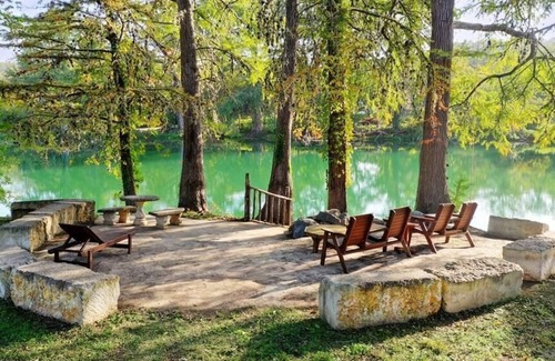Casa Blanca is located between Ingram and Hunt, along the Guadalupe River, on 11 acres with multiple rentals. Guests have free access to 330' of Cypress-lined riverfront, which includes a deck extending over the river, rope swing, rock patio, and spacious lawn area. Recreational equipment and numerous outdoor meeting areas are available throughout the property. Free parking and Wi-Fi for all guests.