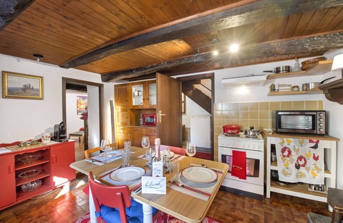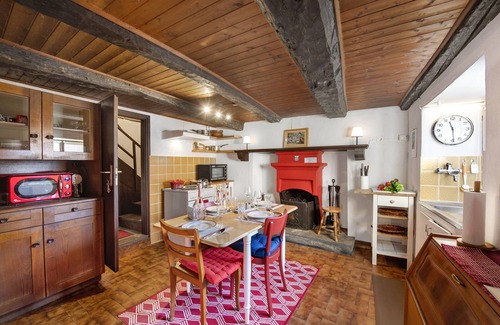 The beamed kitchen/dining room is directly off the entrance courtyard. This cosy room has a dining table and antique wooden furniture. The kitchen is equipped with an induction hob, oven, microwave, fridge/freezer and coffee machine. The separate sitting room, off the kitchen/diner, is furnished with two armchairs and a flat-screen TV.