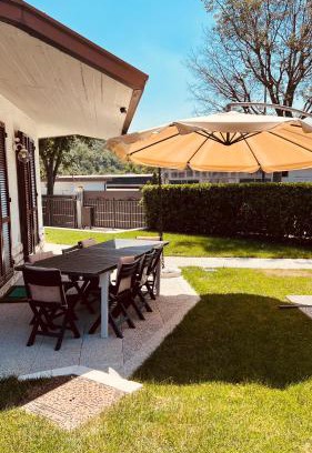 BathroomFree toiletries, Bidet, Body soap, Conditioner, Toilet, Shower, Hairdryer, Toilet paper, Private bathroom, Bathtub or shower, Towels, ShampooGeneralHeating, Iron, Soundproof, Carbon monoxide detector, Safe, Hardwood or parquet floors, Key access, Private entrance, Fire extinguisher, Air conditioning, Trash cansMedia & TechnologyFlat-screen TV, TVKitchenCoffee machine, High chair, Dishwasher, Stovetop, Kitchenware, Cleaning products, Oven, Refrigerator, Dining table, Microwave, Kitchen, Wine glasses, KitchenetteLiving AreaDining area, Sitting area, SofaViewGarden view, ViewBedroomChildrens' cribs, Wardrobe or closet, LinensOutdoorsOutdoor furniture, Outdoor dining area, TerraceAccessibilityEntire unit located on ground floorBuilding CharacteristicsSemi-detached, Private apartment in building, DetachedRoom AmenitiesClothes rack, Hypoallergenic pillow, Drying rack for clothing |