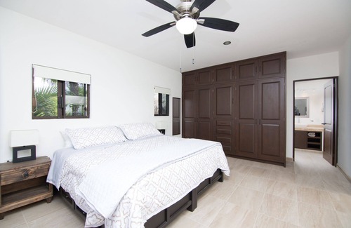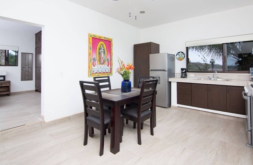 Casa Cascada (waterfall house) est 2012. One acre of lush tropical gardens, many palms cacti, indigenous plants with fruit and vegetable gardens. Completely private oasis. The central feature of the property is a pool waterfall and pool bar. The roof deck of the main house has a fantastic 360 degree view including beach, ocean and one of the best places to watch amazing sunsets! Casita offers 1 bedroom with king bed and a pull out couch full kitchen, living rm. full bath with sundries. LED T.V. Netflix,WIFI.