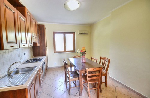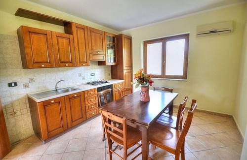 The furnishings of the kitchen are simple and comfortable. It is equipped with a four-burner gas cooker, an electric oven, a refrigerator with freezer and an Italian-style coffee-maker. The dining table can accommodate six guests. The kitchen is also equipped with a television (local channels). The kitchen has a double-glazed window with a view of the greenery and of the hills, and is equipped with an air conditioning/heating unit.