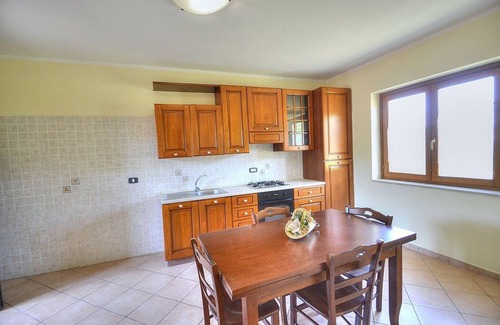 The furnishings of the kitchen are simple and comfortable. It is equipped with a four-burner gas cooker, an electric oven, a refrigerator with freezer and an Italian-style coffee-maker. The dining table can accommodate six guests. The kitchen is also equipped with a television (local channels). The kitchen has a double-glazed window with a view of the greenery and of the hills, and is equipped with an air conditioning/heating unit.