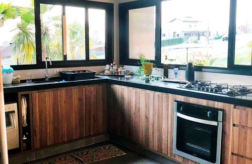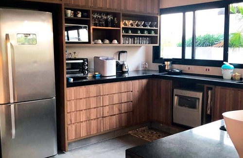 - A cozinha dispõe de fogão embutido, geladeira duplex, lava-louças, micro-ondas, liquidificador, forno elétrico, cafeteira, panelas, louças e utensílios variados
