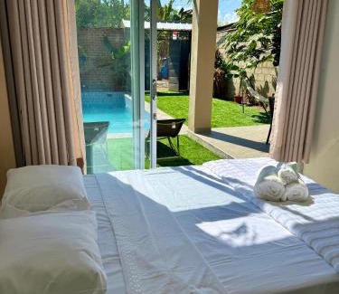 BathroomToilet paper, Toilet, Bathtub or shower, Private bathroom, Shower, Free toiletries, Shower cap, Body soap, Shampoo, Towels, ConditionerMedia & TechnologyFlat-screen TV, Streaming service (like Netflix), TVActivitiesHot tubKitchenCleaning products, Kitchenware, Dining table, Wine glasses, Washing machine, Kitchen, Refrigerator, KitchenetteLiving AreaSitting area, Dining areaGeneralTrash cans, Tile/Marble floor, Private entrance, Fan, CarpetedOutdoorsOutdoor furniture, Outdoor dining area, Private pool, Terrace, PatioViewView, Garden view, Pool viewBedroomWardrobe or closet, LinensAccessibilityEntire unit located on ground floorBuilding CharacteristicsDetachedRoom AmenitiesDrying rack for clothing, Clothes rackPool and SpaPool with a view, Shallow endFood & DrinkBottle of water |