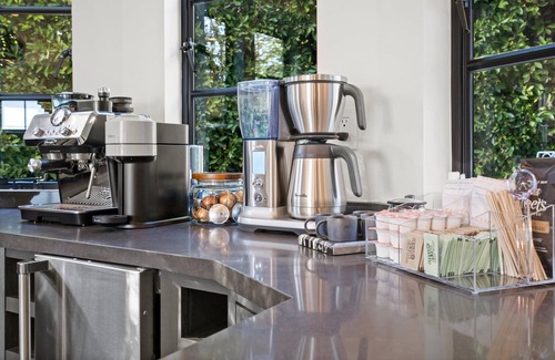 The chef’s kitchen is a dream for culinary enthusiasts, fully stocked with everything needed to create the perfect meal. Thoughtful details include high-end dinnerware, flatware, drinkware, cookware, and bakeware, along with a Breville espresso system and coffee maker to start the morning on the right note.