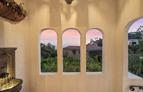 Step through the gates of this private sanctuary, where every detail has been thoughtfully curated to evoke the ambiance of a five-star hotel within the privacy of a residence. The home’s stunning backyard is a true oasis, designed for both relaxation and entertaining. A resort-style pool and hot tub take center stage, surrounded by sun loungers with elegant umbrellas that invite guests to unwind under the California sun. A custom-built outdoor kitchen, complete with a smoker and grill, makes al fresco dining effortless, while the firepit and twinkling string lights set the scene for unforgettable evenings. From certain vantage points, views of the Pacific coastline add an extra layer of magic to this exceptional outdoor space.