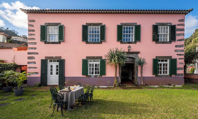 The garden welcomes visitors, with a dining area and areas conducive to leisure time. The enchanting landscape reveals the majesty of the mountains and the unmistakable beauty of the Atlantic sea.