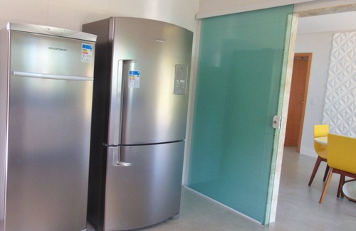 The kitchen has a window to the balcony, with a door that serves as a bar. It is equipped with refrigerator, stove, microwave, freezer, water filter, pots, dishes, glasses, platters, etc.