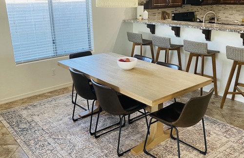 Bring the whole family and friends to this desert paradise! The backyard boasts a sparkling pool, jacuzzi, and patio/grill area equipped with a poolside basketball hoop, pool toys, and outdoor furniture for all to enjoy.