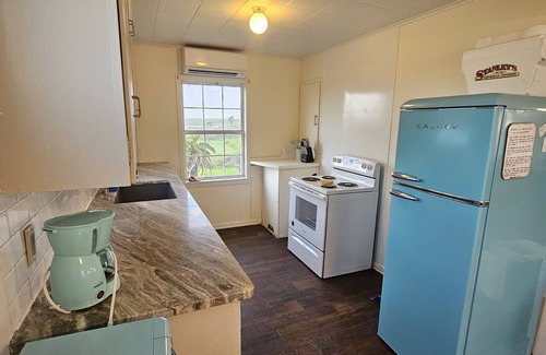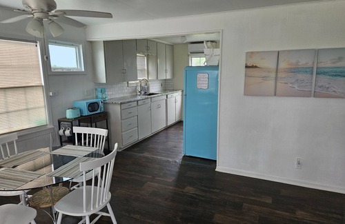 This cozy one bedroom house is just across the street from the dune path to the beach. Come enjoy a peaceful get away as you sit on the deck and watch the sunrise or the ocean while listening to the waves crash on the beach. This entire home features a basic kitchen with a vintage oven. The home also features a picnic table under the house for shaded eating. Enjoy the hammock and the porch swing under the house as well. Two sleeper sofas offer the ability for 2 more queen beds.
