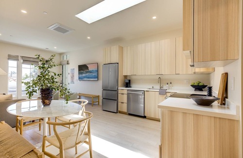 The unit has been immaculately renovated, with its upstairs exterior access in a multi-unit building only two blocks from downtown Santa Barbara & State Street. This 922 sqft, two-bedroom, two-bathroom, fully equipped apartment features a full kitchen set in a large open space with a living room, a private terrace, a bistro table, and chairs. The primary bedroom has a deluxe en suite bathroom with a deluxe shower. The second bedroom has a queen bed and direct access to a Jack and Jill-style bathroom with a walk-in shower. The bathroom is also accessible from the main living area. This high-end unit includes all amenities to provide a comfortable short or longer stay for up to 6 guests, with two sleeping on the high-quality queen-size pull-out sofa. Adjacent to the kitchen, you will find a laundry room with a brand-new LG washer and dryer stack and ironing amenities.