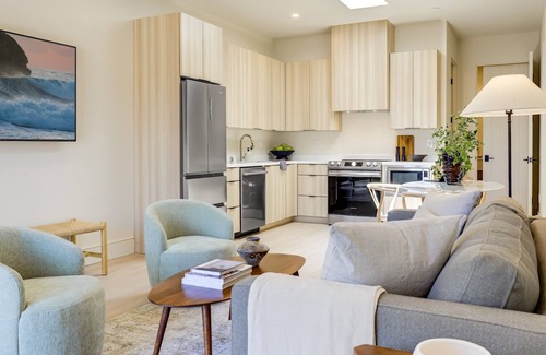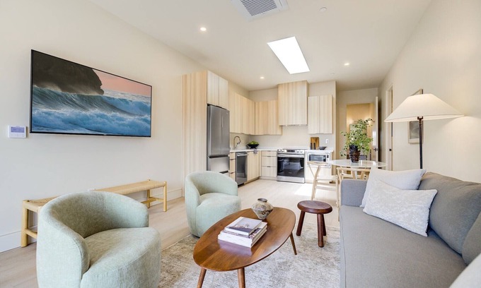 The living room offers a 65" flat-screen Sony Bravia Smart TV with streaming, casting, or Airplay features (no cable) and a Samsung split heating/AC system for ultimate comfort. Each bedroom has a 43" Sony Bravia with features similar to the living room TV. The full kitchen is equipped for all your cooking needs and features a stovetop, oven, dishwasher, microwave, and a Nespresso Vertuo coffee maker. Vertuo pods, as are sugar, sweetener, and coffee creamer, are provided for your stay. Pets are welcome with a small fee per stay.