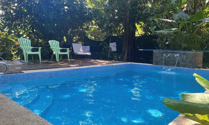 Made of Costa Rican hardwoods and ceramic tiles, this nearly 2000 square feet, 2 BR/2&1/2 Baths home has an open floor plan with Bali Style Pool downstairs where the hummingbirds like to visit, and a wrap around balcony upstairs with 2 spacious bedrooms. The pool was added to the house in September of 2022. The home is surrounded by forests and beautiful fruit trees affording a lot of privacy (with luck you might see toucans eating the papaya); and yet you will not be isolated as there are neighbors close by. The next door neighbor has a guide and taxi service. And another neighbor, Johanna, (just a 2 minute walk away) has a very nice family run restaurant (called a soda in Costa Rica). You must try her Caribbean style corvina (sea bass). A car is not necessary as you will be only minutes walking or biking for anything you may want to see: beautiful beaches, jaguar refuge, horseback riding, restaurants, night life, grocery stores, internet cafe, etc. As an option, 4 banana bikes are at the home available for your use for an extra fee of $5 day/bike, with 2 boogie/body boards included for playing in the ocean. The banana bikes are a popular way to see the sights (if you need more,others are available in town for $6-7/day/bike).