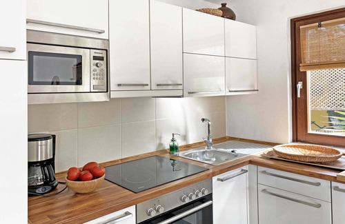 In the vitroceramic open plan kitchen, refrigerator, microwave, oven, freezer, dishwasher, dishes/cutlery, kitchen utensils, coffee machine, toaster, kettle and juicer are provided.