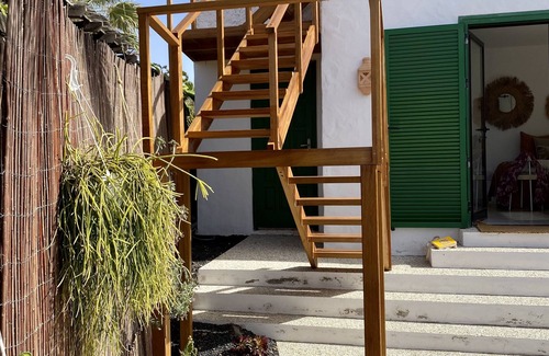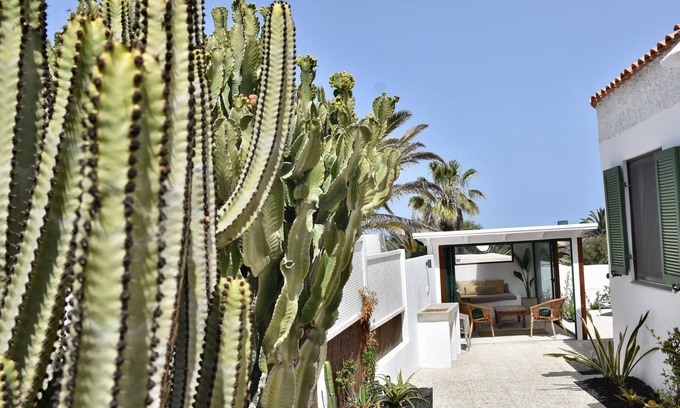 Very bright and cozy house, located in the south of Fuerteventura, with spectacular views of the sea, palm groves and volcanoes. It has various landscaped spaces with native plants, which are oriented to the different moments of maximum sunlight, and protection from the wind. It has a solarium terrace with a panoramic view, sky and stars at night. Silent and calm area, a few meters from La Playa del Viejo Rey, the best on the island for surfing and admiring its sunsets.Very sunny house that has a large living room-dining room-kitchen space, and a large glass door that communicates with a south-facing porch. A bedroom with a 190x200 double bed. Full bathroom with shower. A second bedroom with 3 beds (one of them a trundle bed). A cleanliness. An outside shower. It has a garden to the south, west and north of the house, and a glazed porch, as well as a solarium on the roof, with spectacular views and delimitation that guarantees privacy and security. Views of impressive nature from the house and garden.