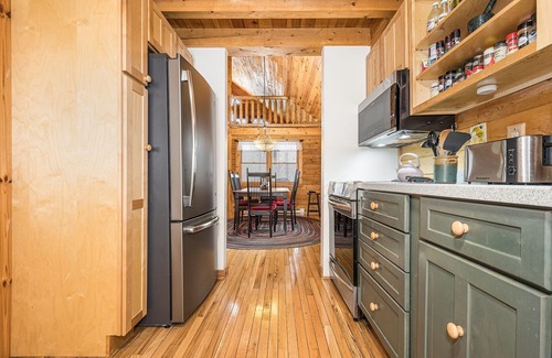 As you approach the cabin, you'll be instantly captivated by the lush natural surroundings and the charming exterior of the cabin. Made of real logs, the cabin exudes a rustic character that's impossible to resist. Once inside, you'll be welcomed by an inviting and cozy atmosphere with a tasteful blend of Craftsman and Americana décor throughout that create the perfect blend of traditional meets modern comfort.