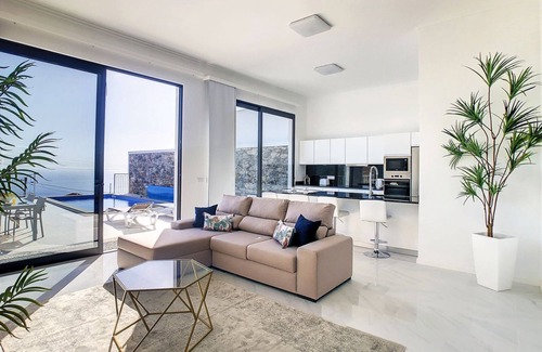 The villa's pristine white exterior harmonizes with the glistening sea, creating a visual masterpiece that's as breathtaking as the views it offers.