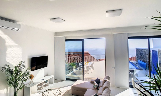 A modern haven of luxury nestled in the stunning coastal town of Calheta. This exquisite villa boasts an unrivaled panoramic view of the endless azure ocean, making it the perfect retreat for those who seek both relaxation and rejuvenation. Perched on a scenic hillside, the villa's design seamlessly blends contemporary aesthetics with the serene surroundings.