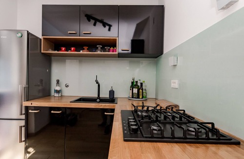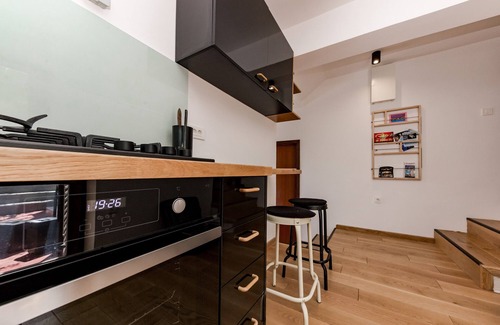 Kitchen - Fully equipped black kitchen with oak finishes has exit and view on the terrace with the olive tree. The kitchen is situated on the level between room 1 and room 2.