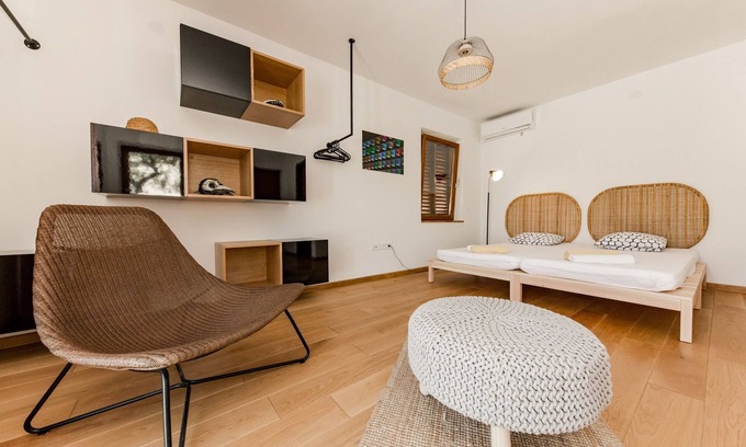 Welcome to Casa Dubi apartment! Recently renovated with a nice view of the garden and olive trees. Casa features 4*cascading spaces - 2*unique designed rooms, each room has its own bathroom, air-condition, and wifi, 1*fully equipped modern black kitchen with exit and view on to one of the plenty terraces around Casa apartment, 1*garage space for a car, storage and washing machine.