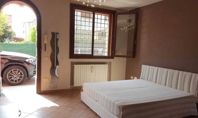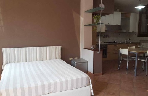 Apartment with independent entrance in the center of Casalgrande RE, ground floor: double bed with pillows and blanket sheets, TV and kitchen with all primary accessories available for cooking.
