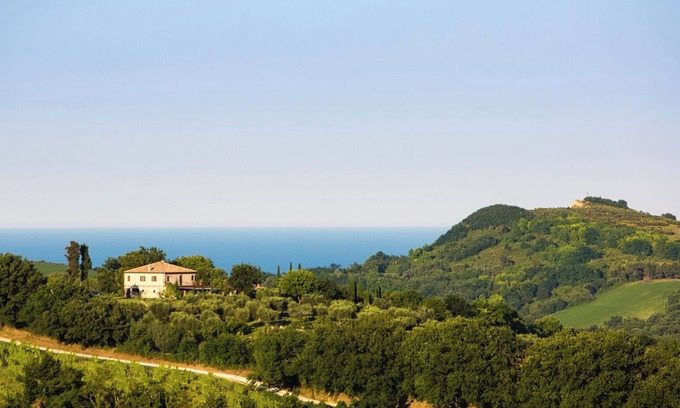 Casa Eugenia is a restored villa with a unique, contemporary style, a panoramic pool and sea views, set on a promontory along the Adriatic coast near Fiorenzuola di Focara. Designed for relaxation and comfort, the spacious interiors combine high-quality finishes, colourful style and artworks. The accommodation is split between the main villa and a separate annex, with four bedrooms and a variety of indoor and outdoor living areas. Set within an extensive, verdant garden, the outdoor area features shaded seating areas, a veranda for outdoor dining and a 16-metre pool overlooking Monte San Bartolo Park. The location is ideal for beach days, countryside drives and visits to Gradara, Urbino and the Riviera Golf of Cattolica.