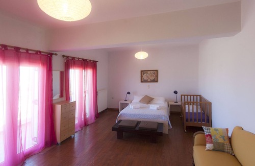 Orfeas bedroom: one of our two very large bedrooms. Located on the first floor of the house, has it’s own private balcony. It is equipped with a double bed, a single bed, a sofa and a desk table. It is possible to add one more single bed and/or a baby cot.