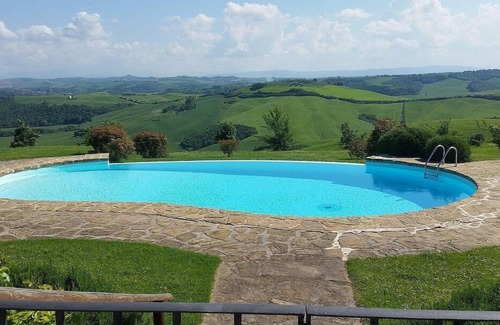 You will reach the swimming pool from the villa going down a route that cuts through the garden and includes approximately six stairway steps. The pool is 7 meters (23 feet) large by 14 meters (46 feet) long, from 60 centimeters (2 feet) to 1.80 meters (6 feet) deep. The swimming pool has a sinuous shape. It is an infinity pool. The area is equipped with sun loungers and an external shower, and it is partly shaded by a characteristic pergola with a bamboo roof. From the swimming pool you will enjoy a fascinating view of the Crete Senesi and of the greenery. You will share the pool with guests staying at 7 other apartments. The swimming pool is open from the beginning of June until the end of September.
