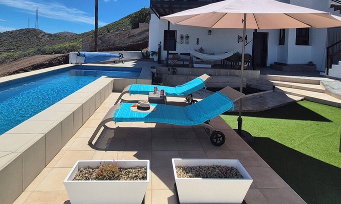It is a newly built country house in a quiet rural area ideal for resting, in the upper part of the town of Cabo Blanco in the south of the island of Tenerife, has a large terrace where you can enjoy a great sunrise or sunset or views to the mountain and the sea and solarium area to get dark, the house has a large kitchen with everything you need to cook without a dishwasher or oven but if a microwave coffee pots and filter ect, the bathroom is not very large but the shower if it is for two people shower comfortably enjoying a rich shower, the room has a dressing room and a large 160 x 200 extra large bed where you can rest after a full day enjoying our wonderful island, a room with several sofas to relax watching TV or reading your favorite book