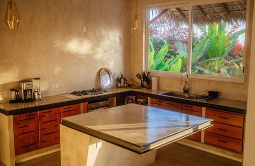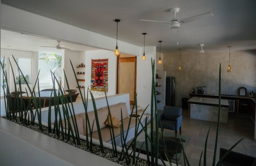 Casa La Bomba has an open design with soaring ceilings, making it ideal for groups or families. The zen garden seamlessly connects to the saltwater pool area, enclosed by a privacy wall. Each of the three spacious bedrooms are independently private with ensuite baths showcasing beautiful carpentry and details. The kitchen, living, and dining area are all interconnected, providing ample opportunities for guests to hang out, cook, chat, and entertain. Additionally, the second-floor outdoor area is a perfect spot to unwind with a coffee, practice yoga, or take in breathtaking ocean sunsets and sweeping views Zicatela’s lighthouses and La Punta’s waves.