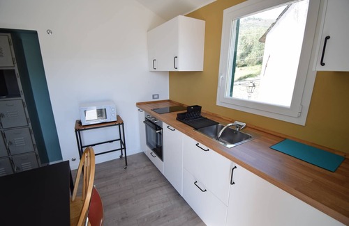 A few kilometers from the sea and the center of Diano Marina, in a small Ligurian village, this bright, recently renovated village house features two bedrooms sleeping up to four people, a living room with kitchenette, bathroom, and a large terrace overlooking the valley. It also includes air conditioning, a dishwasher, washing machine, refrigerator, oven, microwave, and coffee maker.