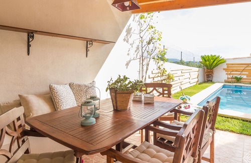 The outdoor area stands out for its large private pool and its furnished terrace area with porch. To access the pool area you have to go down some stairs.