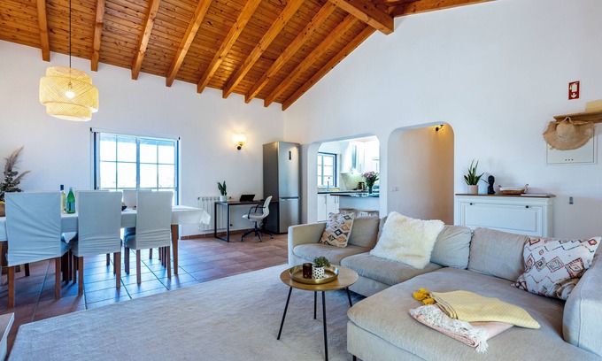 As you step into the villa, be greeted by the expansive living area where natural light pours through large windows, creating a warm and inviting atmosphere. The living space flows into a state-of-the-art, fully equipped kitchen. Step outside to one of the private terraces and unwind in the stylish hanging chair, where you can soak in breathtaking views of the serene Vale da Telha landscapes or have a cozy meal at the front terrace. In the morning the sun hits the front terrace to enjoy your morning coffee and in the afternoon the back terrace for amazing sunsets. Whether you're seeking sun or shade you're always covered by simply switching sides.
