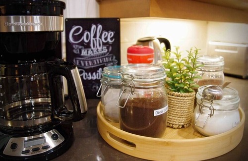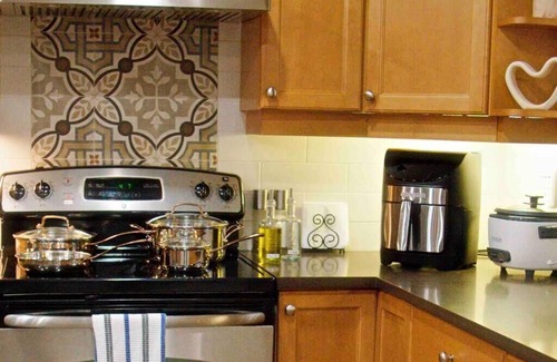 Well-Equipped Kitchen: Prepare meals with ease in our fully equipped kitchen featuring modern appliances. Complimentary tea, coffee, salt, sugar, olive oil, vinegar, and pepper are provided.