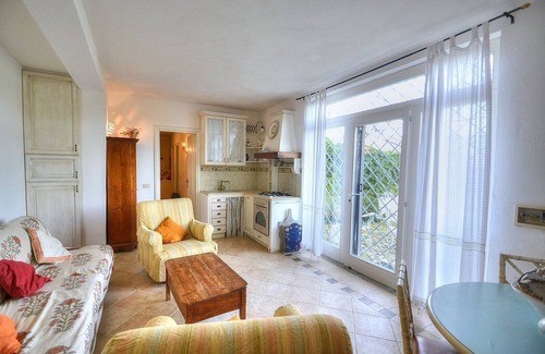 The living room is paved with terracotta tiles. The furnishings are cozy and comfortable. The furnishings include a sofa and two armchairs. In the living room you will also find a cooking area. The kitchenette is equipped with a four-burner gas cooker, a refrigerator with freezer and an Italian-style coffee-maker. The dining table can accommodate four guests. In this room you will find a flat-screen satellite television (local channels). From the living room you will be able to enter the patio through a French door. The room is equipped with an air conditioning/heating unit.