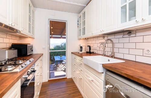 Beautiful Casa Mokki brings something unique and different to our collection of holiday homes in and around Sitges. This charming wooden lodge is set in a peaceful location in the beautiful pine covered hills of Las Colinas and comes with a private swimming pool, fantastic hot tub and wonderful views across the valley to the rolling hills of the Garraf Natural Park.As well as enjoying a tranquil and natural setting, Casa Mokki is less than a 20-minute scenic drive to the bustling holiday resort of Sitges with its numerous bars, restaurants, and boutiques as well as its excellent sandy Blue Flag Mediterranean beaches. What’s more, the cosmopolitan city of Barcelona is only a 45-minute drive away and the airport just 35 minutes.The chalet has been beautifully updated with bright and modern interiors and comfortable furnishings, and yet it still manages to retain much of its original rustic charm.ACCOMMODATIONThis beautiful lodge is well equipped to the standards you would expect of a quality holiday home and offers every amenity necessary to make your holiday at Casa Mokki a memorable experience.Ground FloorThe front door of Casa Mokki leads straight into an attractive living/dining space. This communal area is nicely furnished with a comfortable sofa, an armchair, coffee table and large TV. The dining area features a custom-built dining table seating up to 10 guests and even has an overhead projector for family movie nights.The kitchen is modern and fully equipped with 4-ring gas hob, oven, fridge freezer, dishwasher and coffee machine. The kitchen conveniently has direct access out to a covered outdoor al fresco dining area and hot tub.The first of the 3 bedrooms is located off the living room. This cozy room offers a double bed as well as a small annex accommodating a single bed, which could be extended to a double bed at a squeeze.Also on this floor is a bathroom with shower, washbasin and WC. This bathroom also has a washing machine and dryer for guest use.First FloorThe 1st floor is accessed by stairs from the living/dining area and features 2 good sized and comfortable double bedrooms; one with a balcony facing the front of the house and the other with a window offering beautiful views of the rolling hills of the Garraf natural park.There is a bathroom conveniently located between the two bedrooms.BEDROOMSCasa Mokki can sleep up to 7 guests in 3 bedrooms (plus annex) as follows.Bedroom 1 – ground floor – double (150cm x 200cm), wardrobe plus annex with single bed that can be made into a double but with limited space.Bedroom 2- 1st floor – double (160cm x 200cm) with wardrobe, TV & wonderful views.Bedroom 3 – 1st floor – twin beds (can be pushed together to make a double) wardrobe, TV, balcony with two sun loungers.BathroomsBathroom 1 – ground floor – shower, washbasin, WC.Bathroom 2 – 1st floor – shower, washbasin, WC.OUTSIDE SPACESThe outside spaces at Casa Mokki are perfectly set up for enjoying a fantastic family holiday in the Mediterranean sunshine.The 5.5m x 3.5m private swimming pool and hot tub are surrounded by attractive gardens with plenty of space for sunbathing and relaxation. Guests can enjoy panoramic vistas across the valley whilst relaxing in the jacuzzi.The covered terrace area offers the ideal place for alfresco dining with a dining table seating 8 guests, BBQ and ambient lighting to set the mood. There is also comfortable lounge seating, perfect for relaxing out of the hot midday sun or for enjoying after dinner drinks in the evening.The ping pong table is located in the garden.There is off street parking for up to 2/3 cars and free street parking outside the house.