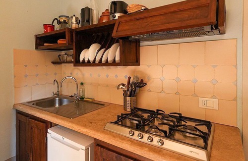 The furnishings of the living room are rural and characteristic of the Tuscan house. The furnishings include a sofa. In the living room you will also find a cooking area. The kitchenette is equipped with a four-burner gas cooker, an electric oven, a small refrigerator without freezer, an Italian-style coffee-maker, a toaster and a kettle. The dining table can accommodate four guests. From the living room you will be able to enter the garden through a French door.