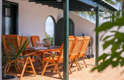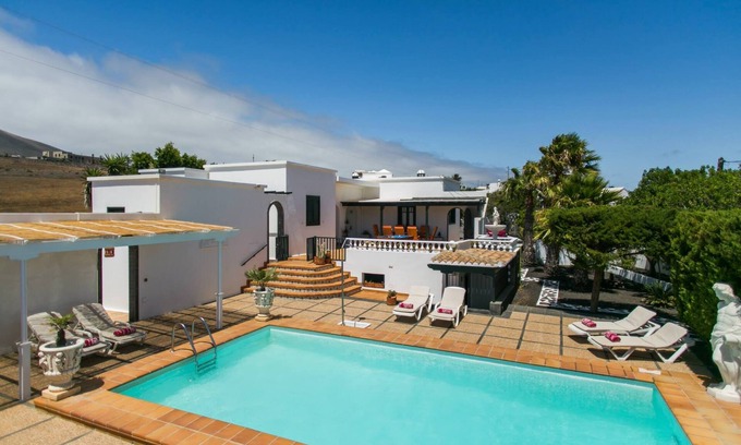 Villa Nicole is situated a short drive from Puerto Del Carmen in the quiet, scenic village of Macher. Central to all points on the Island, the villa is in the perfect spot for peace, relaxation and convenience. Perched high it enjoys magnificent views of the mountains, the islands rugged beauty and across the sea to the neighbouring island of Fuerteventura. Set in established and well maintained gardens the villa has recently been given a complete facelift. As of August 2025 visitors will be welcomed to all new furnishings, bedding and appliances. A lovely sleek white gloss kitchen, wireless internet TV including movies, box sets and TV series awaits you. This is in addition to the heated pool at no extra charge , portable BBQ, open dining area, and free WIFI.