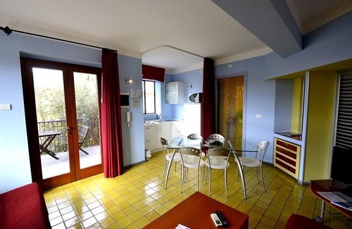 The terrace is 6 square meters (65 square feet) large. It is partly shaded by a porch. It is equipped with a table and chairs. From the terrace you will enjoy a characteristic view of the greenery and, partially, of the sea.