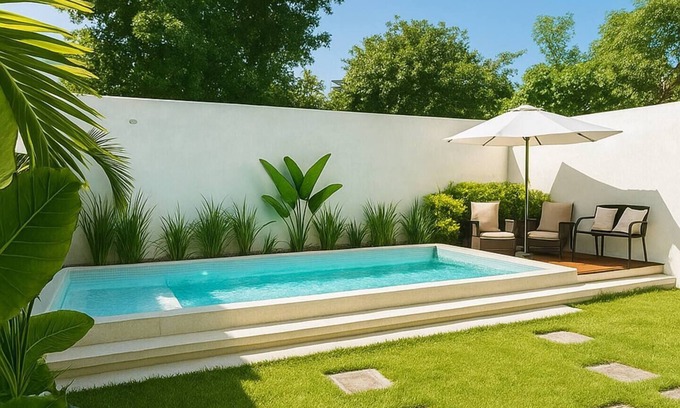 Unwind in the cozy second lounge area or step outside to enjoy your private pool, complete with an outdoor shower and a shaded seating area with a table and comfortable chairs, perfect for relaxing, dining, or simply enjoying the tropical breeze.