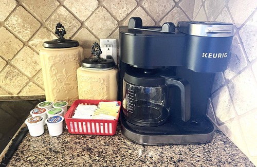 Kitchen: fully stocked with pots/pans, dishes and silverware, linens, coffee pot, toaster, serving accessories, and more.
