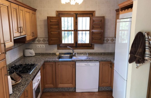 The spacious lounge has two settees, an LG smart TV with over 120 channels (Spanish, English, German, Austrian, Norwegian and Swedish), Netflix, Prime Video, amongst others, and an Apple TV. The full kitchen is very well equipped. Outside there is a very private solar heated pool, extensive sun terraces and a large covered eating area next to the pool, with outside kitchen and BBQ. There is also a covered terrace at the front of the villa where you can sit or doze in the shade if it's too hot by the pool or to sip a glass of vino and watch the sun go down over the mountains. The Wi-Fi (15 Mbps download) covers the whole property.