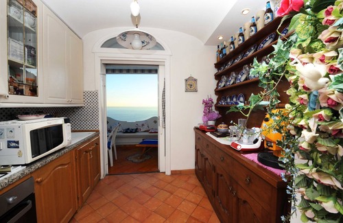 you will be able to enter the kitchen from the living room through an arched opening. It is equipped with a four-burner gas cooker, an electric oven, a refrigerator with freezer, a microwave oven, an Italian-style coffee-maker, an American-style coffee-maker (bring your filters!), a toaster and other small appliances. From the kitchen to the French door will take you to the terrace with the view of the sea.