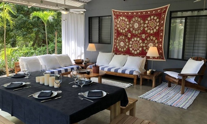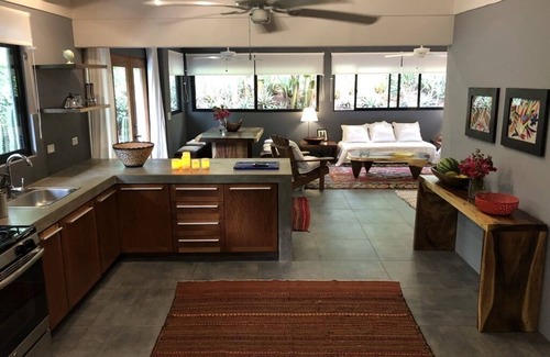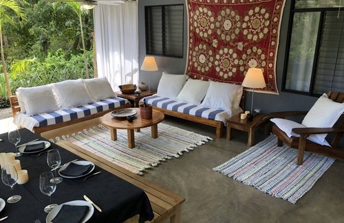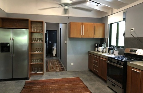 Unwind at this beautifully decorated 3 bedroom house 15 minutes drive to Tamarindo. The home offers a fully equipped kitchen that blends with a cozy living and dining area. Enjoy a morning coffee on the outdoor sofa surrounded by a lush tropical garden and wildlife. The outdoor space also offers a spacious dining and BBQ area. The house is located on a natural reserve in Cañafistula, a tranquil town; a few minutes drive to some of the most spectacular beaches in Guanacaste with quick access to nearby supermarkets. The area offers beautiful trails for long walks in nature, hilltop hikes, and mountain bike rides. The house is fully equipped and perfect for family or friends.