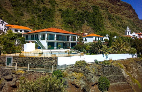 The villa looks out to sea from the edge of the village, it is reached on foot by a 150 m pedestrian path from the village square. The villa is 20 m above sea level with an uninterrupted 180 degree sea view over the Jardim do Mar surf break. Facing South West it enjoys spectacular sunsets and moonlight seascapes. The upper floor provides our own accommodation when we visit Madeira and is not offered for rental. This upper floor will be unoccupied from April to September. The lower floor provides a self-contained guest apartment with one en-suite double bedroom and one en-suite twin bedroom, a lounge looking out over the private pool and garden to the sea and a fully fitted kitchen with fridge/freezer, microwave and dishwasher. There is TV and Wi Fi internet. A third en-suite double bedroom which is accessed from the entrance hall is available at a small extra cost. There is a separate laundry room. The cliff top location and the pool mean that small children will require close supervision.