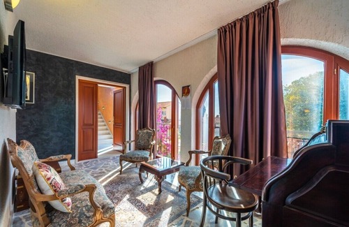 House for 7-8 persons: approx. 260 m2, spread over three floors. On the ground floor there is a rustic dining area, a cozy living space, a fully equipped kitchen and a bathroom with shower. On the first floor of this charming house, every corner is designed with utmost care so that you can feel completely comfortable and enjoy your free time. A spacious common room, with several comfortable seating areas, provides a perfect spot to relax und unwind. Additionally, there is a living room with a comfortable sofa set and three bedrooms on the first floor. The first bedroom features a double bed, and a small living area (without a door) with sleeping option for one person as well as TV and air conditioning. The second bedroom also has a double bed and a bright anteroom with antique seating and TV. The third bedroom is furnished with a single bed. Air conditioning on the first floor is available in the hallway between the second and third bedroom. Additionally, there is a bathroom with a bathtub. The balcony can be accessed from the hallway on the first floor. On the second floor there is a bedroom with a double bed, two armchairs, air conditioning and a balcony with sea view. There is also a bathroom with shower, which leads to another balcony featuring an inflatable jacuzzi for two and two sun loungers.