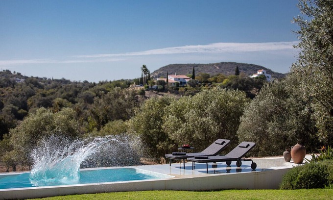 Casa Sabados is a quietly located holiday home for six people in the Algarve. Modern architecture with floor-to-ceiling windows, numerous terraces, and a stylish 15-meter pool make this a designer dream house.